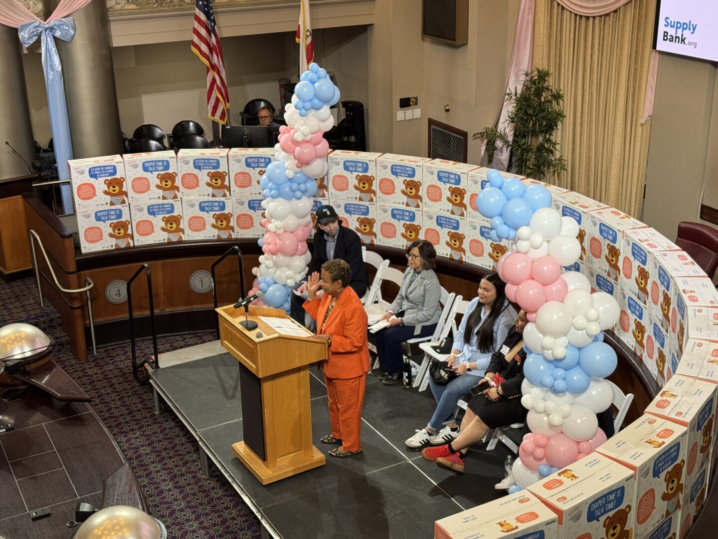 Oakland, CA (February 23, 2026) — At a time when rising costs are placing unprecedented strain on families with young children, SupplyBank.org marked its 10th anniversary as a diaper bank by launching a new partnership with Too Small to Fail, the early childhood initiative of the Clinton Foundation. At a ribbon- and balloon-filled City Hall Rotunda, the organizations introduced an exclusive new line of diapers and wipes designed to address diaper need while supporting early brain and language development.